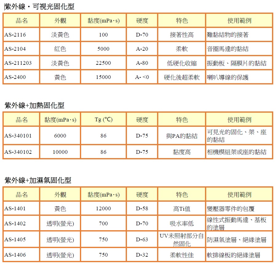 UV固化型膠水是藉由紫外線或可視光的照射、使起始劑活化產生硬化反應的壓克力膠水。即使是不同材質之間的黏結也有良好的接著性,也是這個系列的特長。